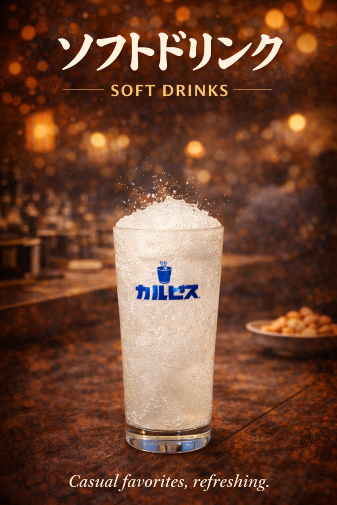 And for lighter moments, we serve a variety of Japanese soft drinks, including our Calpis-inspired creations — creamy, citrusy, and nostalgic.